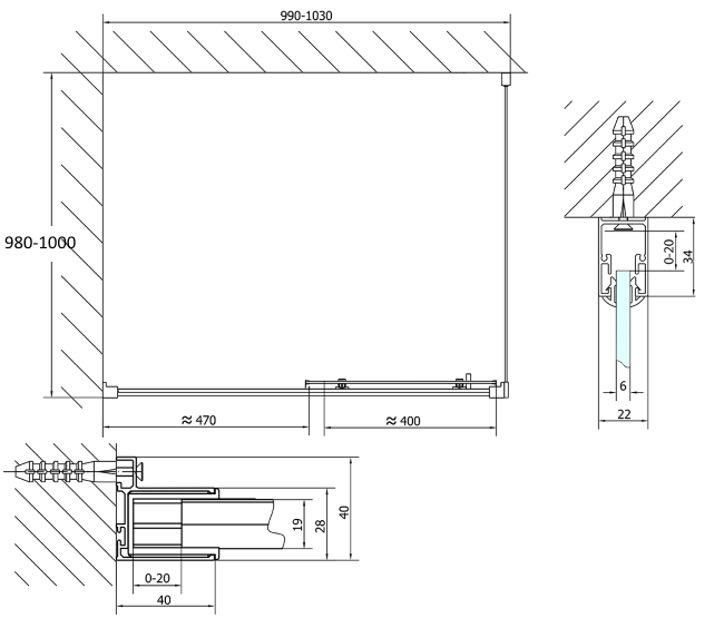 - Dimensiuni (mm): L=990-1030; l=980-1000; deschidere=400; h=1900