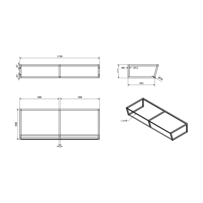 - Dimensiuni (mm): L=1196; l=403/458; h=200
