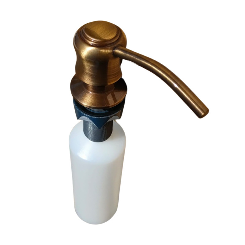 Dozator pentru detergent special conceput pentru accesorizarea unei chiuvete de bucatarie sau a unui lavoar de baie. Elementele vizibile sunt fabricate din alama si finisate in bronz periat. Reprezinta o alegere potrivita pentru completarea unei amenajari cu accente de bronz. Este prevazut cu un mecanism precis de pompare a detergentului, pentru o dozare controlata a detegentului lichid.
