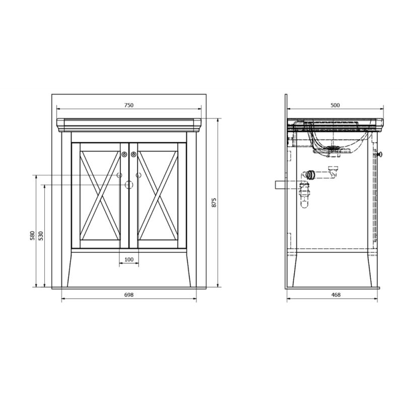 Dulapul este conceput pentru sustinerea unui lavoar compatibil ca forma si dimensiuni. Este prevazut cu doua usi batante, avand cadrul din lemn si sticla cu aspect de gheata.