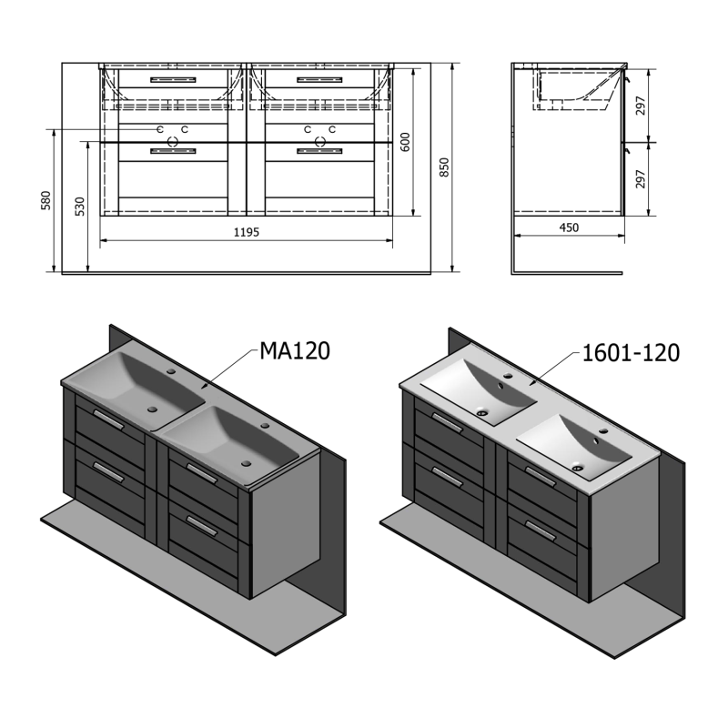 - Dimensiuni (mm): L=1190; l=450; h=600; h recomandat de la podea pana la suprafata lavoarului: 850