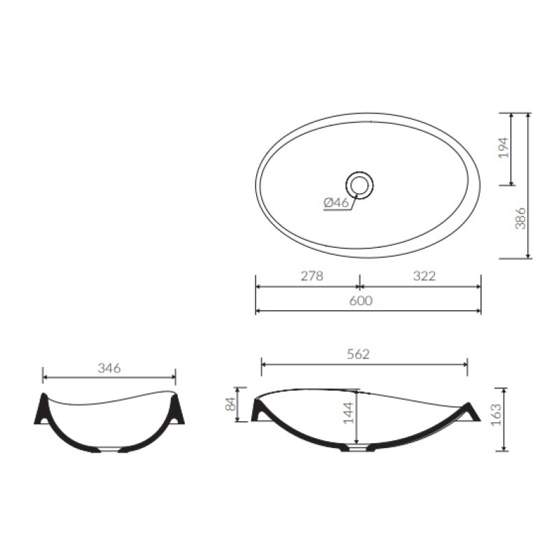 - Dimensiuni (mm): L=600; l=386; h=84/163
